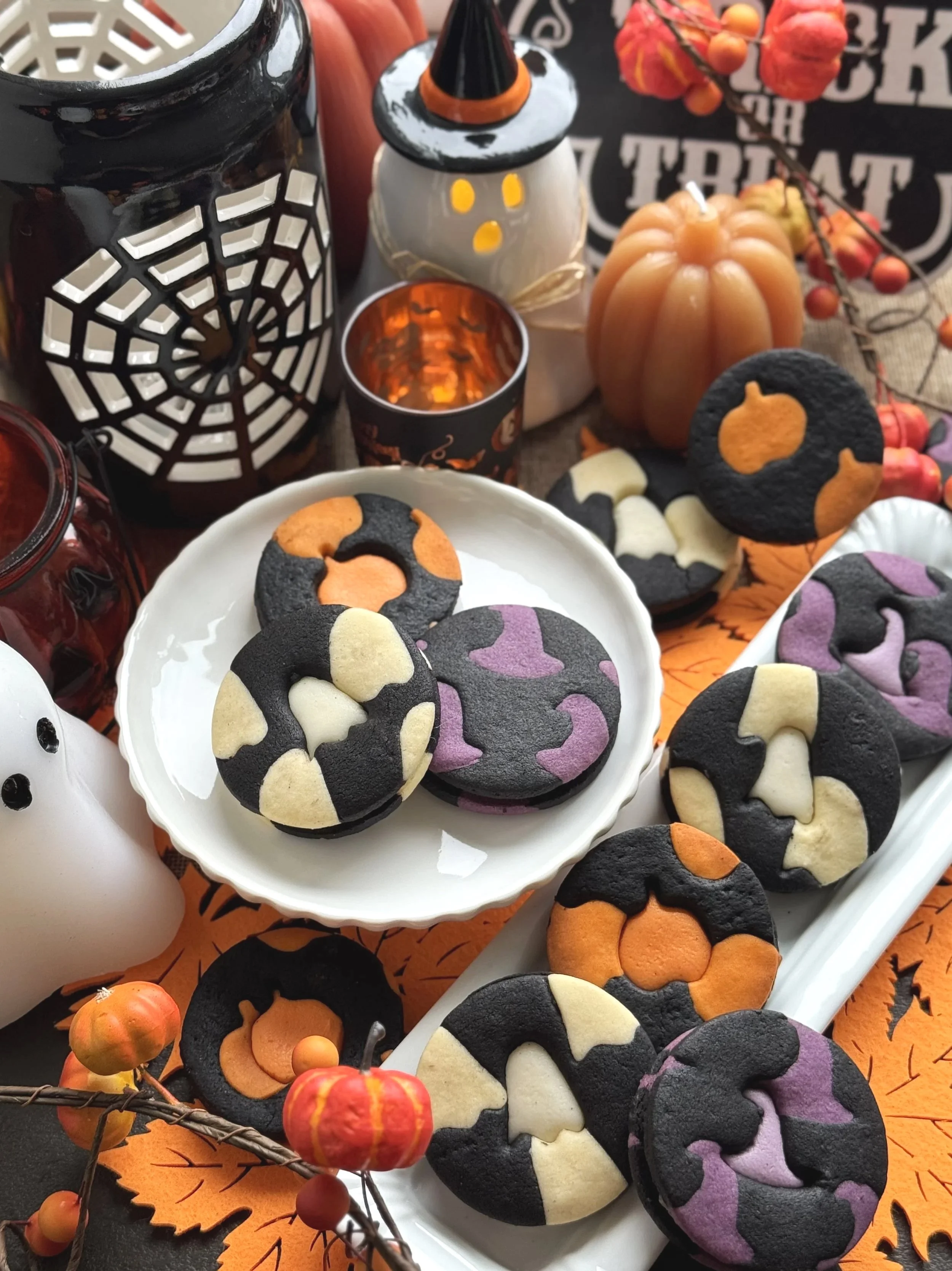 These adorable Halloween Linzer cookies feature a rich chocolate cookie base inlaid with colourful vanilla dough cut-outs: spooky ghosts, cheerful pumpkins, and cute witches’ hats! The buttery chocolate and vanilla layers create a fun contrast, and the cookies are sandwiched with tinted vanilla buttercream for that striking Halloween look.
