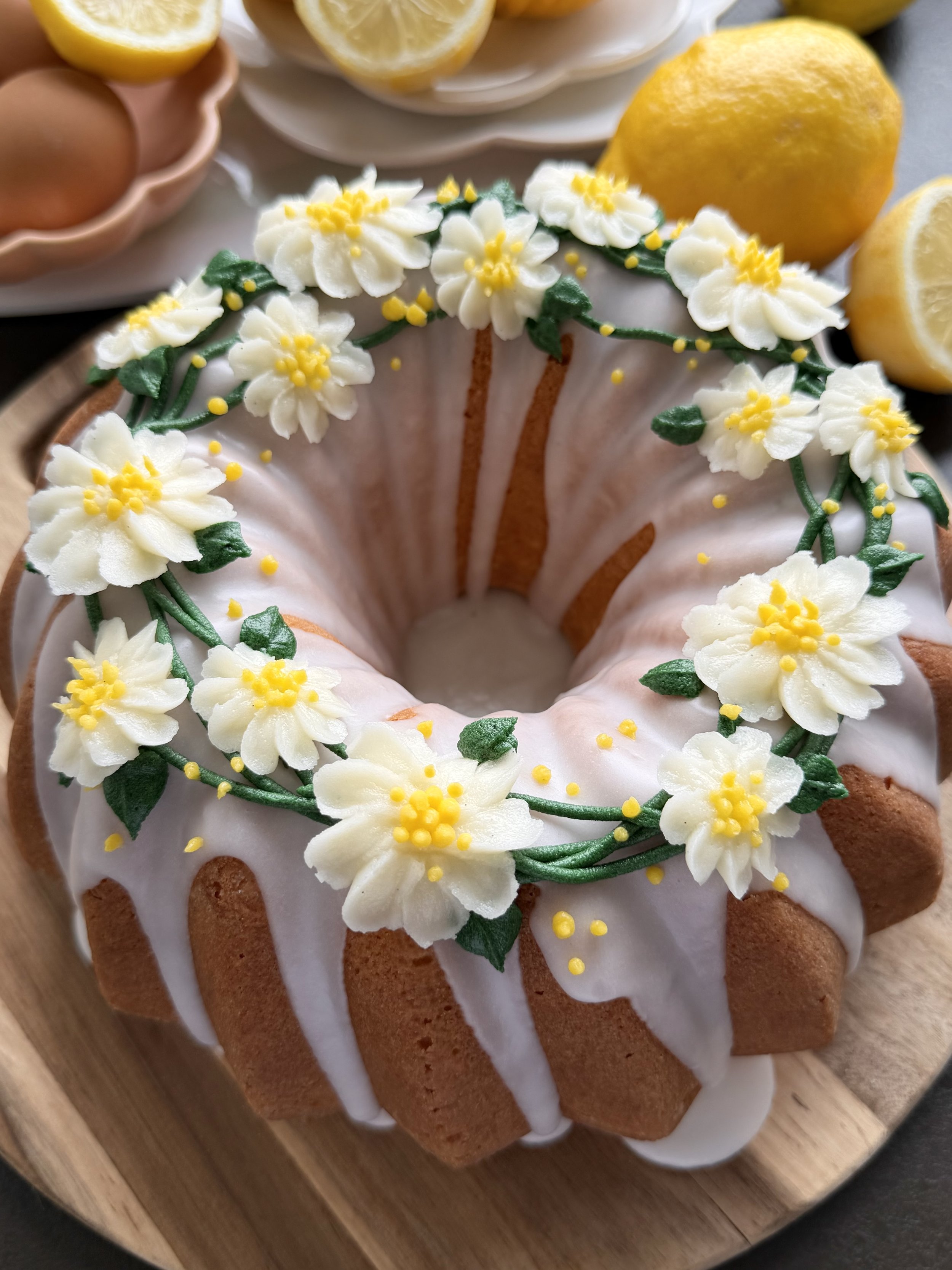 Soft, buttery and bursting with fresh lemon flavour, this Bundt cake is one of those bakes that feels simple but looks so special. The crumb is tender and light, the glaze adds the perfect zing, and that little buttercream daisy wreath on top? Just the cutest finishing touch.